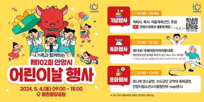 안양시는 제102회 어린이날(5.5.)을 맞아 5월 4일 평촌중앙공원에서 세계 최초 아동권리기관인 세이브더칠드런의 ‘제14회 국제어린이마라톤’ 대회와 함께 ‘어린이날 행사’를 개최한다고 1일 밝혔다.