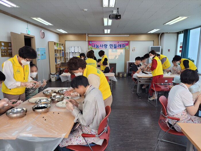 수원시 나눔사랑민들레봉사단 회원 등 20여 명은 에이블 장애인직장 적응 훈련센터 훈련생들과 함께 송편, 강정을 만들어 먹었다.
