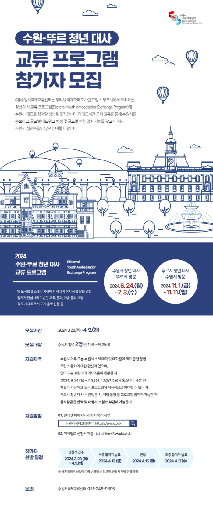 수원시국제교류센터가 ‘2024 수원-뚜르 청년 대사 교류 프로그램’에 참가할 청년(만 19~25세) 2명을 4월 9일까지 추가 모집한다.
