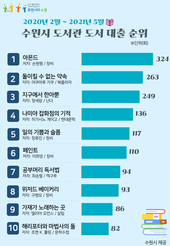 코로나19 사태 이후 수원시민이 수원시도서관에서 가장 많이 빌린 책은 소설 「아몬드」인 것으로 나타났다.