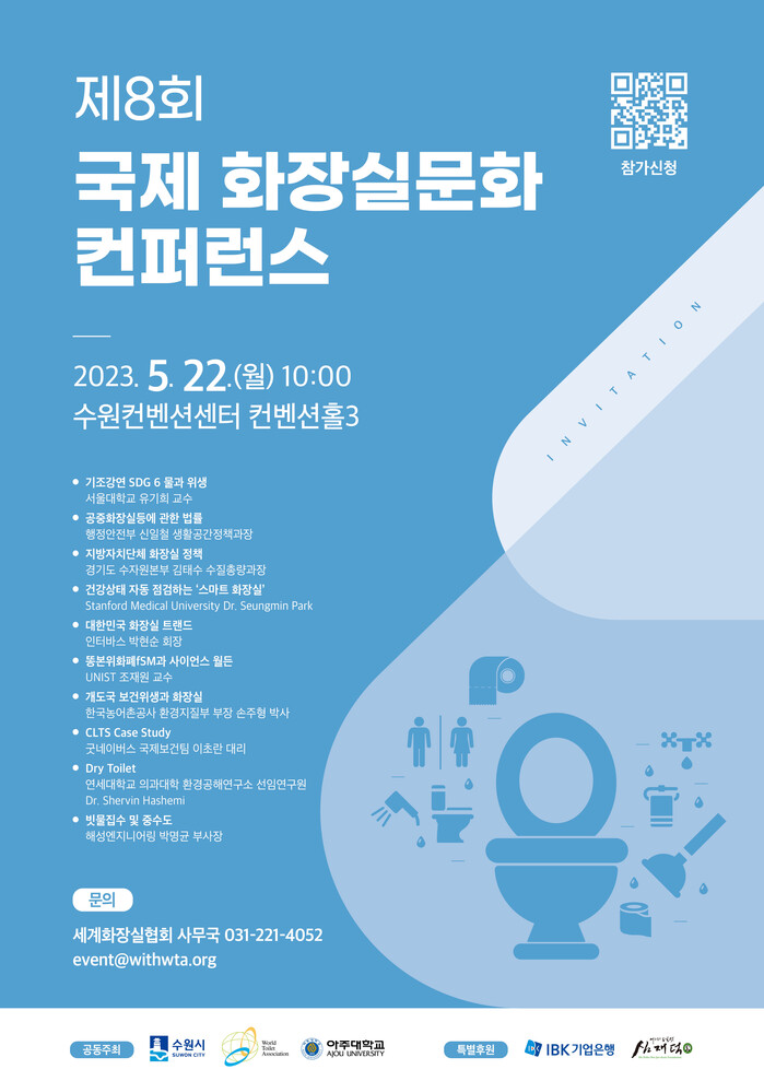 WTA와 수원시, 아주대학교가 공동주최하는 국제화장실문화 콘퍼런스는 이재준 수원특례시장 환영사, ‘SDG6 물과 위생’을 주제로 하는 유기희 서울대학교 교수의 기조 강연, 주제 발표로 이어진다.