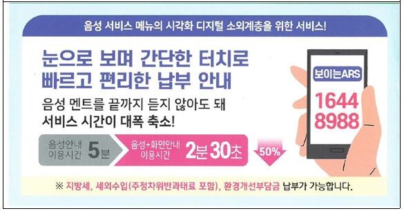 '보이는 세입통합 ARS 납부 시스템'은 회원가입, 인증서 발급 등 까다롭고 복잡한 절차 없이, 간단히 본인 확인절차를 거쳐 전국 어디서나 전화(☎1644-8988) 한 통화로 쉽고 편하게 납부할 수 있다. 시는 시범운영을 거쳐 7월 12일부터 본격 운영할 계획이다.