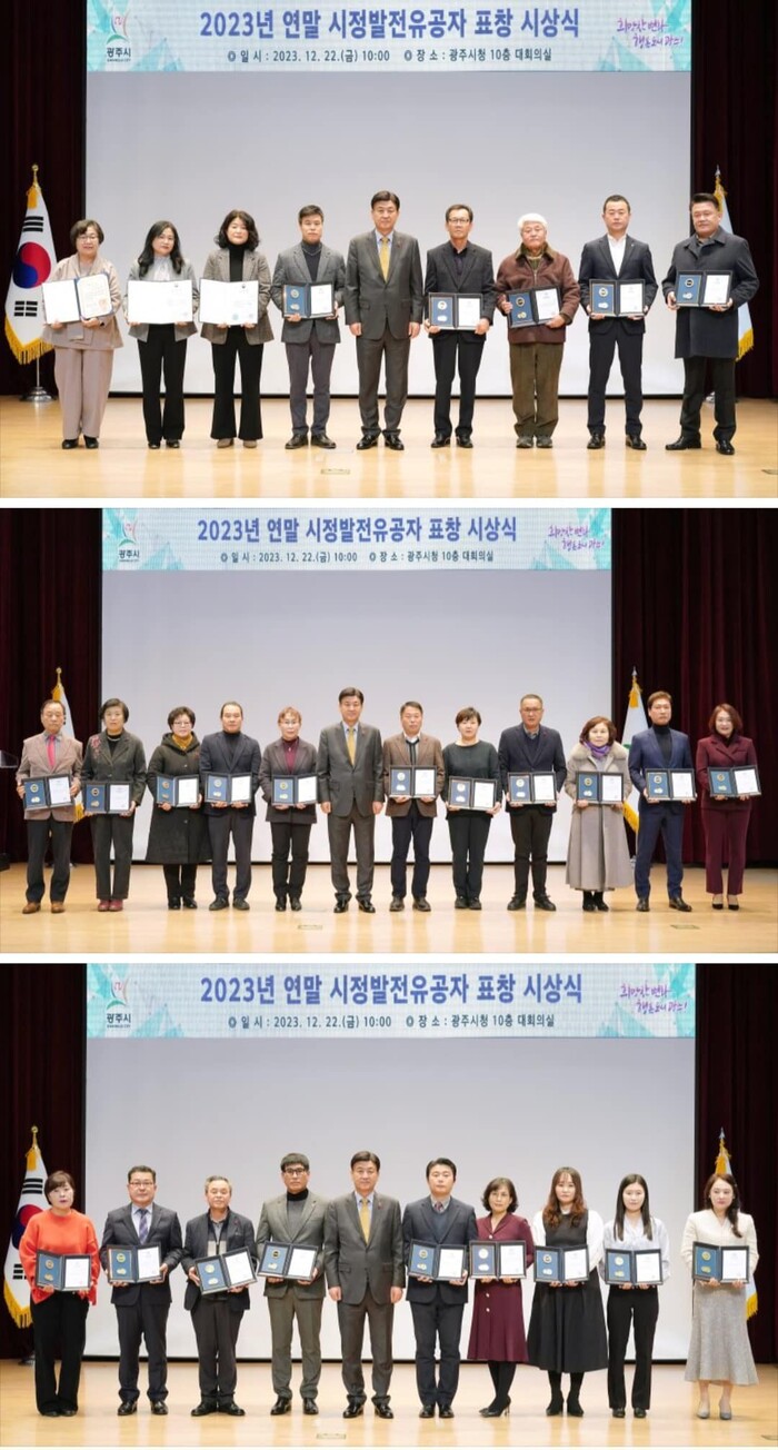 방 시장은 이어 “2024 WASBE 세계관악컨퍼런스 광주 D-207!”를 전하며, 이날 <2023년 연말 시정발전유공자 시상식, 광주시 장애인체육회 직원 간담회, 제12회 광주시 사랑의 끈 연결운동 행사, 대한적십자사광주시구협의회 총회 및 회장 이·취임식, 이웃돕기 기탁식(시민상조회, 코원에너지서비스), 광주시 이통장협의회 12월 월례회의, 고엽제전우회 창림기념회 및 송년회, 광주로타리 및 광남로타리 클럽 연차총회, 보고 청취 및 결재> 등 시민 여러분과 함께했다고 밝혔다.