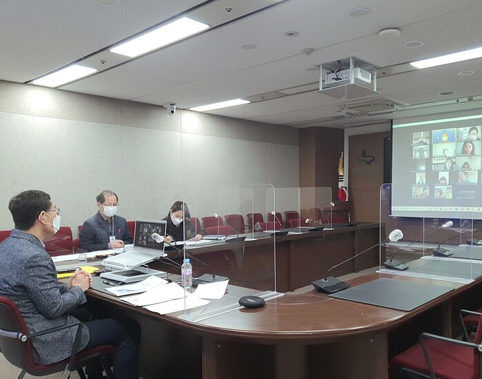 사진/ 3월 15일 시청 영상회의실에서 화상회의 프로그램을 활용해 진행된 ‘문화 다양성 이해 교육 강사 간담회·맞춤형 전문가 교육’(사진제공=수원시)