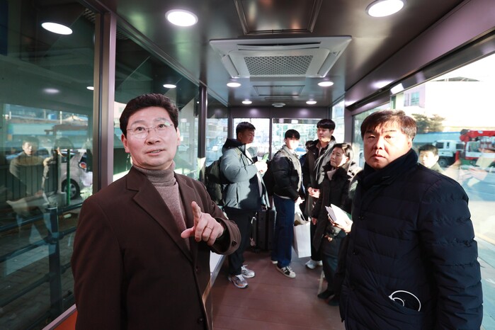 이 시장은 새 스마트정류장 안에서 추위를 피해 버스를 기다리는 시민들과 반갑게 인사를 나누고 시설을 꼼꼼히 살피며 계획대로 잘 설치됐는지 확인했다.