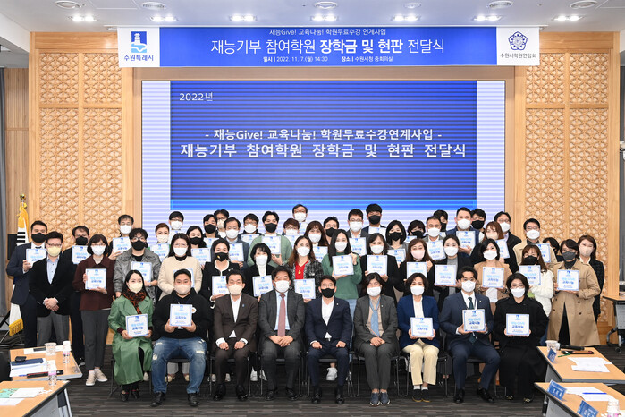 한편 수원시학원연합회는 지난 10월 15~16일 수원컨벤션센터에서 연 ‘2022 수원시학원연합회 나눔바자회’ 수익금 500만 원을 “저소득층 학생 장학금으로 사용해 달라”며 수원시에 전달했다.