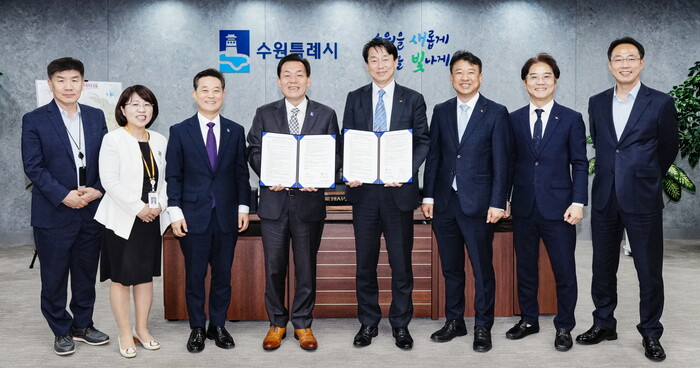 사진/이재준 수원시장(왼쪽 4번째), 김경덕 SK브로드밴드 CIC장(오른쪽 4번째) 등이 협약 후 함께하고 있다.(사진제공=수원시)