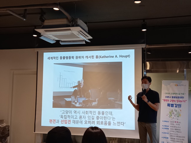 <사진/ 이학범씨가 ‘고양이의 외로움을 아시나요?’를 주제로 강의하고 있다.>