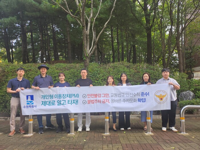 이번 캠페인에는 수원남부경찰서, 시청 교통정책과, 영통구 안전건설과, 영통1동·2동 행정복지센터, 망포2동 행정복지센터 관계자 등이 참여해 신영초등학교에서 망포역, 청명고에서 청명역 사이 구간에서 PM 이용자와 시민에게 PM 안전 이용 수칙을 안내하고 홍보물을 배부했다.
