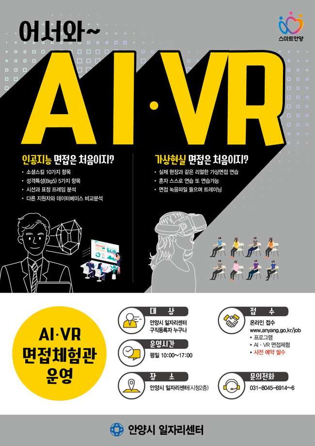 시 일자리센터는 청사2층에 있으며, AI·VR체험관은 홈페이지(www.anyang.go.kr/job)에서 사전예약을 통해 이용할 수 있다.