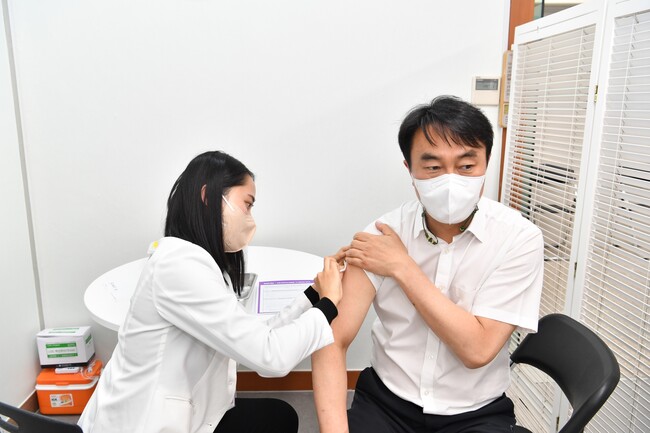김 시장은 지난 4월과 6월 아스트라제네카(AZ) 백신으로 1·2차 접종을 마쳤다. 이어 지난 6일 3차 접종을 받으면서 “60세 이상 고령층과 3차 접종일이 도래한 시민들께서도 추가 접종에 적극 동참해 달라”고 독려했다.