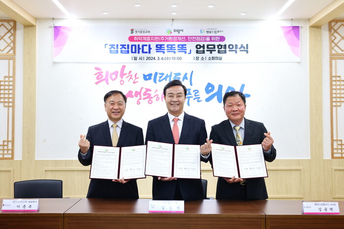 의왕시(시장 김성제)는 3월 6일 시청 소회의실에서 경기중앙교회(담임목사 이춘복), 사회적협동조합 행복드림플러스(이사장 김용택)와 취약계층 지원을 위한‘집집마다 똑똑똑’사업의 업무협약을 추진했다고 밝혔다.