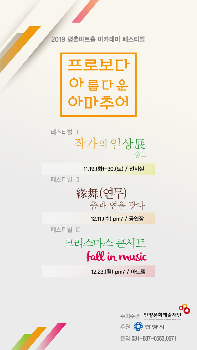 2019년 평촌아트홀 아카데미 음악 페스티벌은 성황리에 끝난 미술·무용 아카데미 페스티벌의 이어 음악아카데미 수강생들이 그동안 갈고닦은 기량을 펼치는 뜻깊은 자리이다. 이번 크리스마스 콘서트 “FALL IN MUSIC” 공연에서는 음악아카데미 강좌인 플루트, 바이올린, 색소폰, 우쿨렐레, 통기타, 드럼, 국악&퓨전난타 등 크리스마스 및 겨울을 주제로 한 곡들로 구성되어 있다. 한 해를 마무리함에 특별하고 따듯한 크리스마스 선물이 될 것이다.