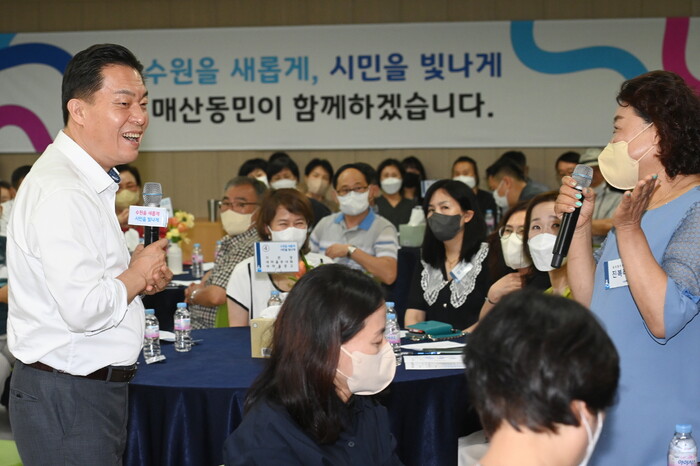 사진/ 지난 7월 말 매산동에서 열린 ‘시민이 꿈꾸는 수원이야기’에서 이재준 수원특례시장과 한 주민이 대화를 나누고 있다.(사진제공=수원시)