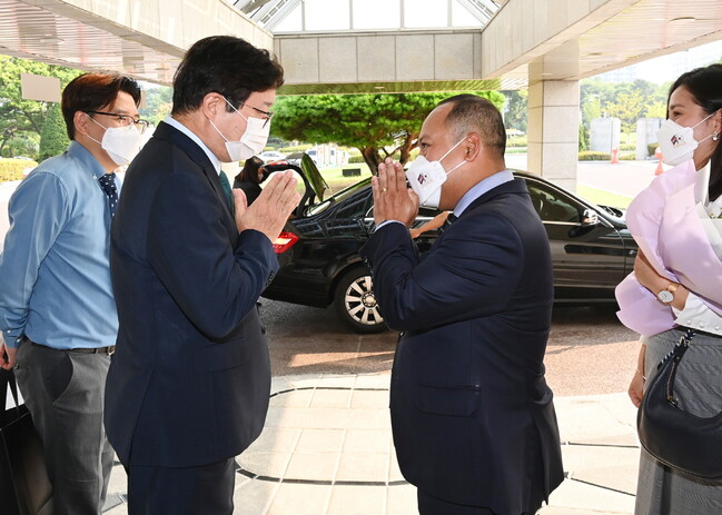 사진/염태영 시장(왼쪽)이 환담을 마치고 수원시청을 떠나는 롱 디멍 주한캄보디아 대사에게 인사하고 있다.(사진제공=수원시)
