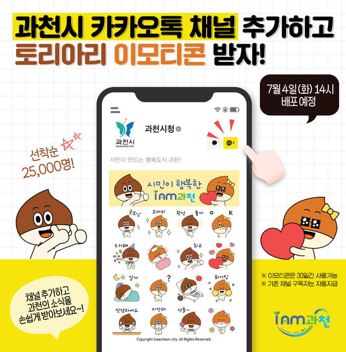 과천시는 공식 마스코트인 ‘토리’와 ‘아리’ 캐릭터를 이모티콘으로 제작해 7월 4일 오후 2시부터 시 공식 카카오톡 채널을 통해 무료로 배포하는 이벤트를 진행한다.