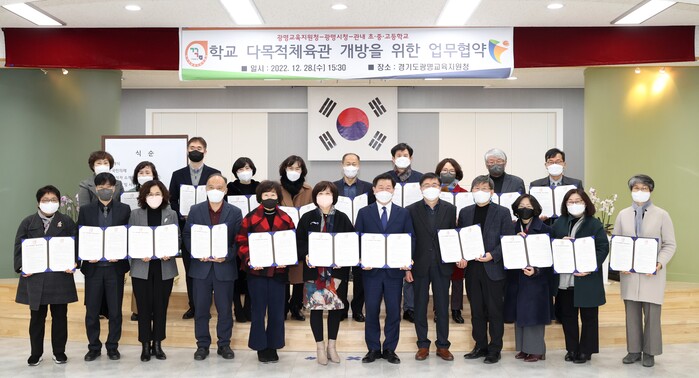 광명시(시장 박승원)는 28일 광명교육지원청에서 박승원 광명시장, 류관숙 교육장, 31개 초.중.고 학교장과 ‘학교 다목적체육관 개방을 위한 업무협약’을 체결하고 2023년 3월부터 유휴시간대에 학교 다목적체육관을 시민에게 전면 개방한다. 시는 학교 다목적체육관 개방에 따른 운영인력과 시설 유지보수비 등 행정적, 재정적 지원을 강화한다.