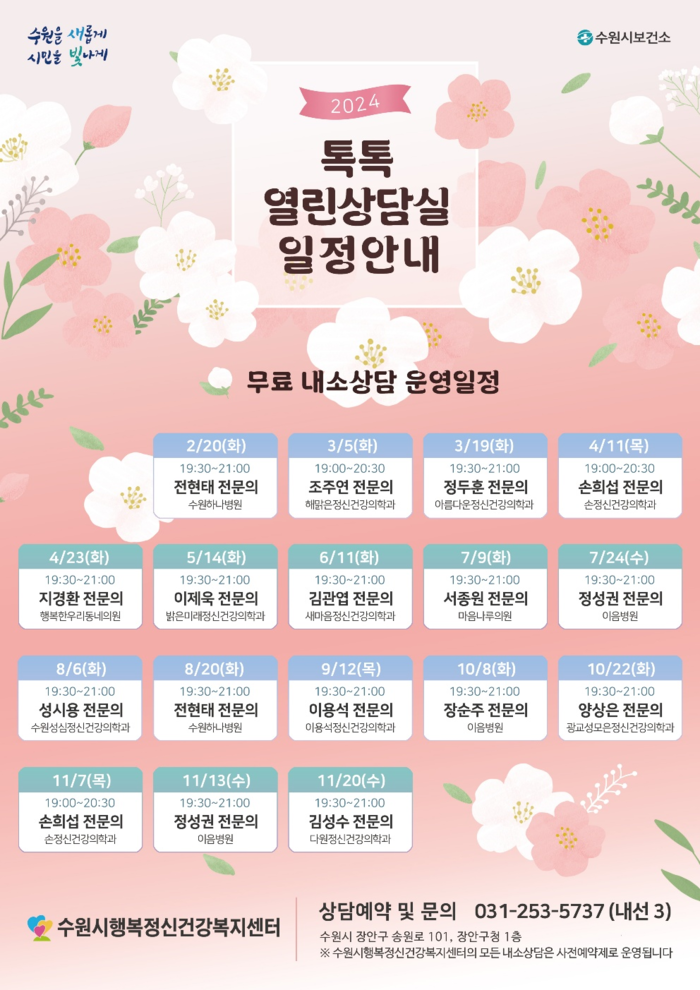 수원시행복정신건강복지센터가 ‘2024 톡톡열린야간상담실’을 11월까지 총 17회 운영한다.