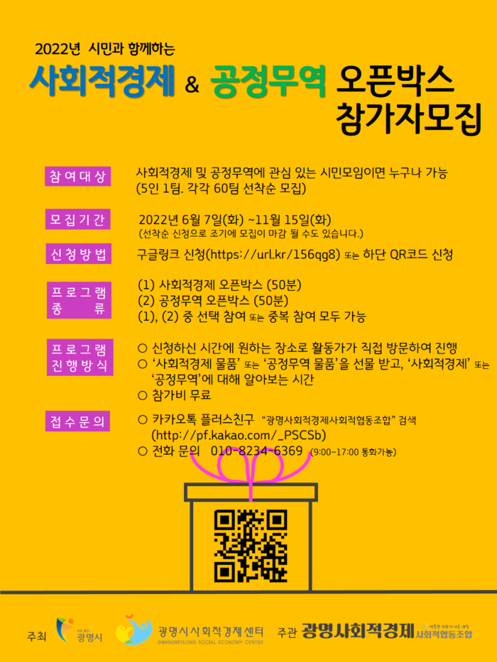 「사회적경제&공정무역 오픈박스」에 대한 자세한 사항은 카카오톡 플러스 친구 “광명사회적경제사회적협동조합” 검색(http://pf.kakao.com/_PSCSb) 또는 전화(☎ 010-8234-6369)로 문의하면 된다.