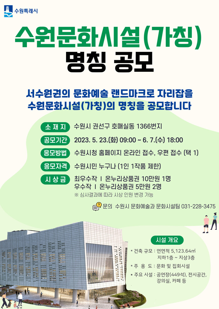 수원시가 11월 준공 예정인 ‘수원문화시설(가칭)’의 명칭을 6월 7일까지 공모한다.