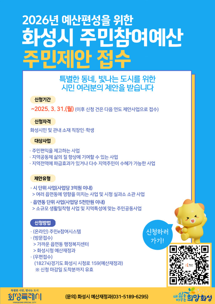 화성특례시(시장 정명근)는 이달부터 3월 31일까지 ‘2026년 예산편성을 위한 주민참여예산 주민제안사업’을 접수한다.
