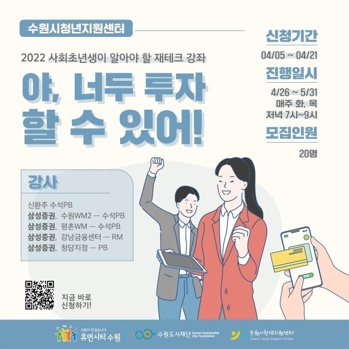 수원시청년지원센터가 21일까지 ‘2022년 사회초년생이 알아야 할 재테크 강좌-야, 너두 투자할 수 있어!’ 프로그램에 참여할 수강생 20명을 선착순으로 모집한다.