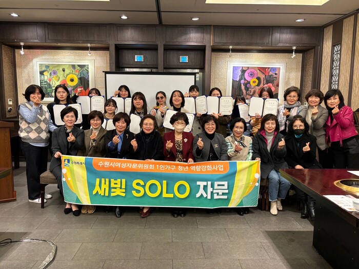 수원시가 수원시여성자문위원회와 함께 수원시 1인 가구 청년 16명을 대상으로 역량 강화 교육으로 진행된 ‘새빛 솔로(Solo) 자문’ 수료식이 15일 인계동 한 음식점에서 열렸다.