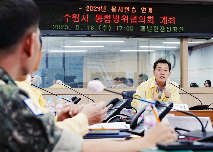 수원시는 지난 16일 오후 5시 수원시청 본관 지하 1층 재난안전상황실에서 ‘2023년 을지연습 연계 수원시 통합방위협의회’를 개최했다.