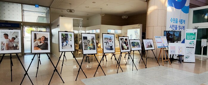 사진/수원시청 본관 1층 로비에 전시된 ‘제8회 아이가 있어 행복한 가족 사진·UCC 공모전’ 수상작(사진제공=수원시)