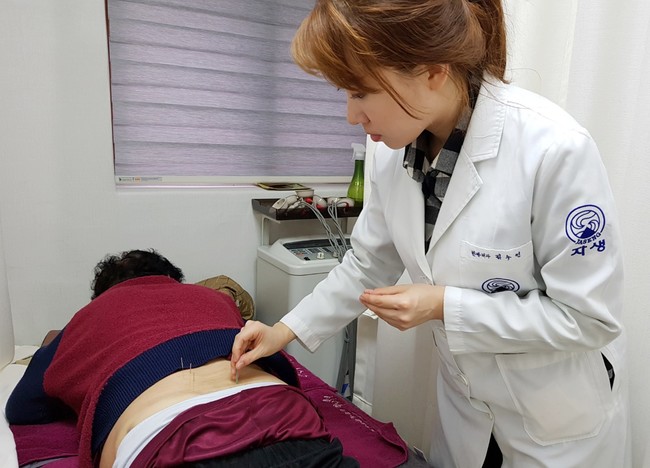 사진/ 분당자생한방병원 의료진이 진료소를 찾은 근골격계 환자에게 침 치료를 실시하고 있다.