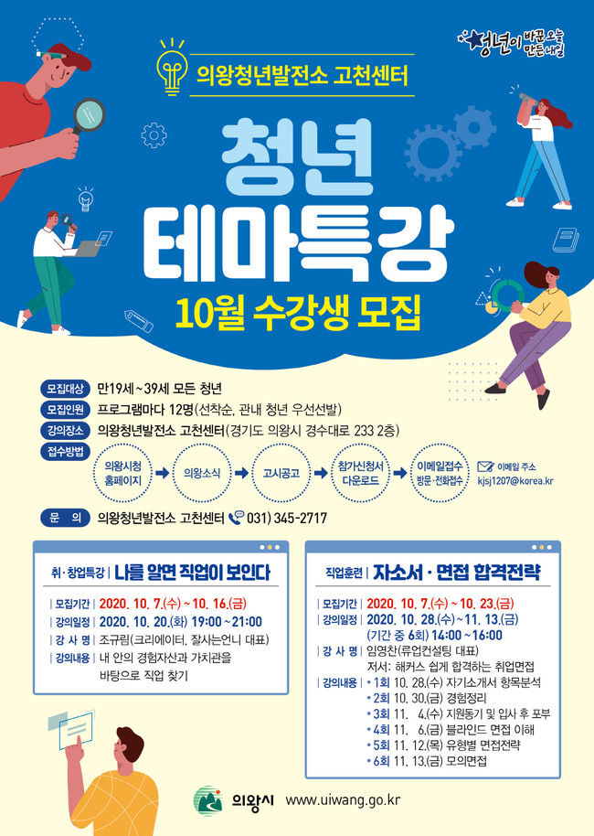 [로컬라이프] 의왕시(시장 김상돈)는 의왕청년발전소 고천센터에서 운영하는 10월 테마특강 수강생을 모집한다.