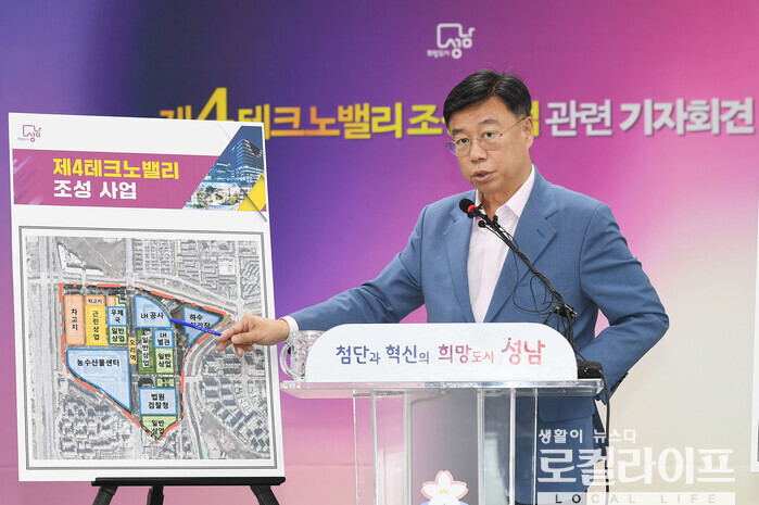 | ▲ 신상진 성남시장은 '오리역 제4테크노밸리'와 '위례 포스코 글로벌센터'로 성남의 미래산업지도를 완성하겠다는 구상이다. 사진은 지난 2024년 9월 11일, 신상진 시장이 '오리역 일원 제4테크노밸리 조성 사업 관련 기자회견'을 하는 모습. (사진제공=성남시) |