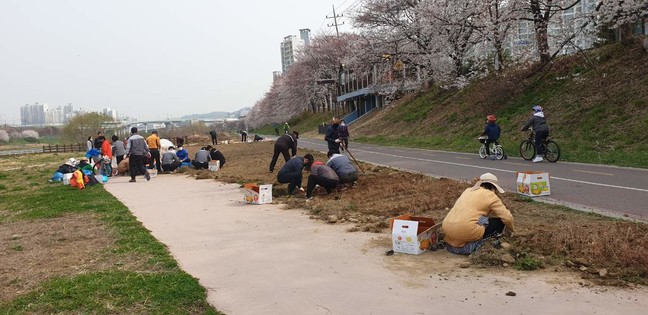 하천변에 야생화가 조성에는 안양천과 학의천 변을 관할구역으로 하는 비산2동과 안양1동 그리고 석수2동의 동 사회단체 주민 백여 명이 봉사활동에 나섰다.