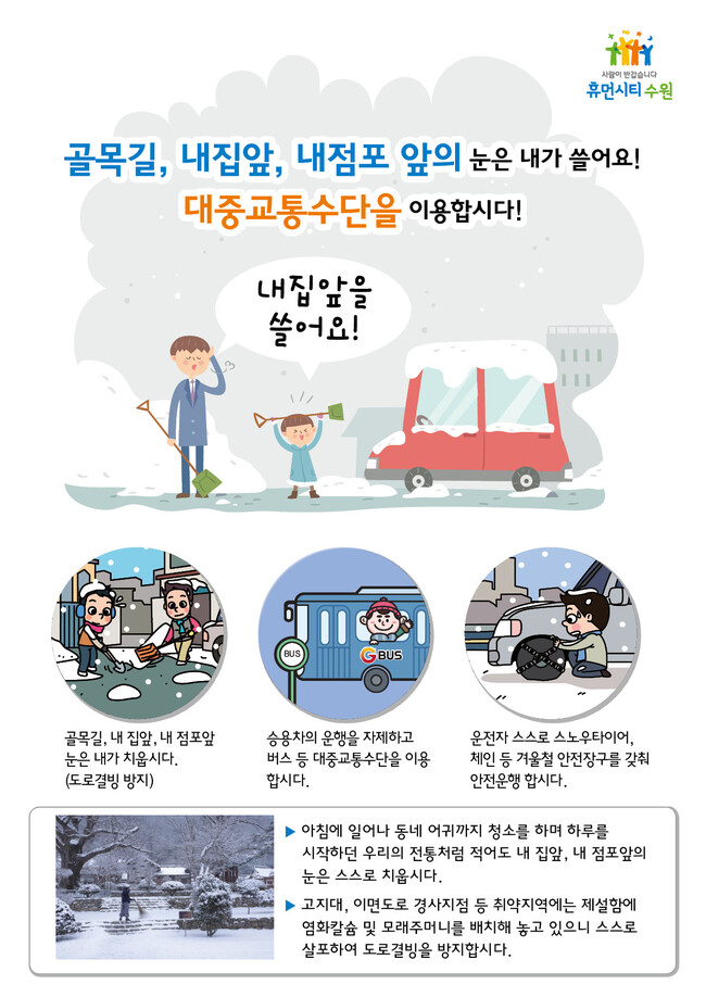 수원시는 ‘내 집, 내 점포 앞 눈 치우기 운동’과 ‘강설 시 시민행동요령’ 홍보물 1만 300매를 제작해 시·구청 민원부서와 동행정복지센터에 배부했다.