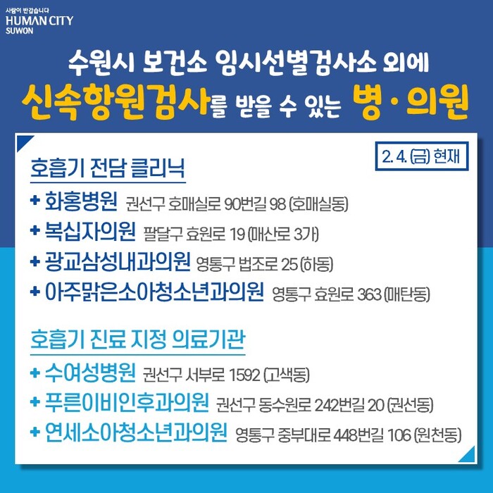 현재 수원시 4개 구 보건소 임시선별검사소 외에 신속항원검사를 받을 수 있는 병·의원은 호흡기 전담 클리닉인 화홍병원(호매실동)·복십자의원(매산로3가)·광교삼성내과의원(하동)·아주맑은소아청소년과의원(매탄동)과 호흡기 진료지정 의료기관인 수여성병원(고색동)·푸른이비인후과의원(권선동)·연세소아청소년과의원(원천동) 등 7곳이다.