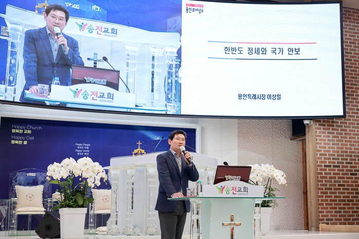 이상일 용인특례시장이 26일 처인구 이동읍 송전교회(담임목사 권준호)에서 용인시기독교총연합회 임원진과 가족 등 80여명을 대상으로 '한반도 정세와 국가 안보' 특강을 진행했다.