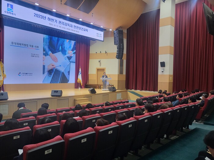 수원시가 중대산업재해를 예방하고 안전한 근로환경을 조성하기 위해 12일 시청 대강당에서 관리감독자를 대상으로 안전보건교육을 했다.