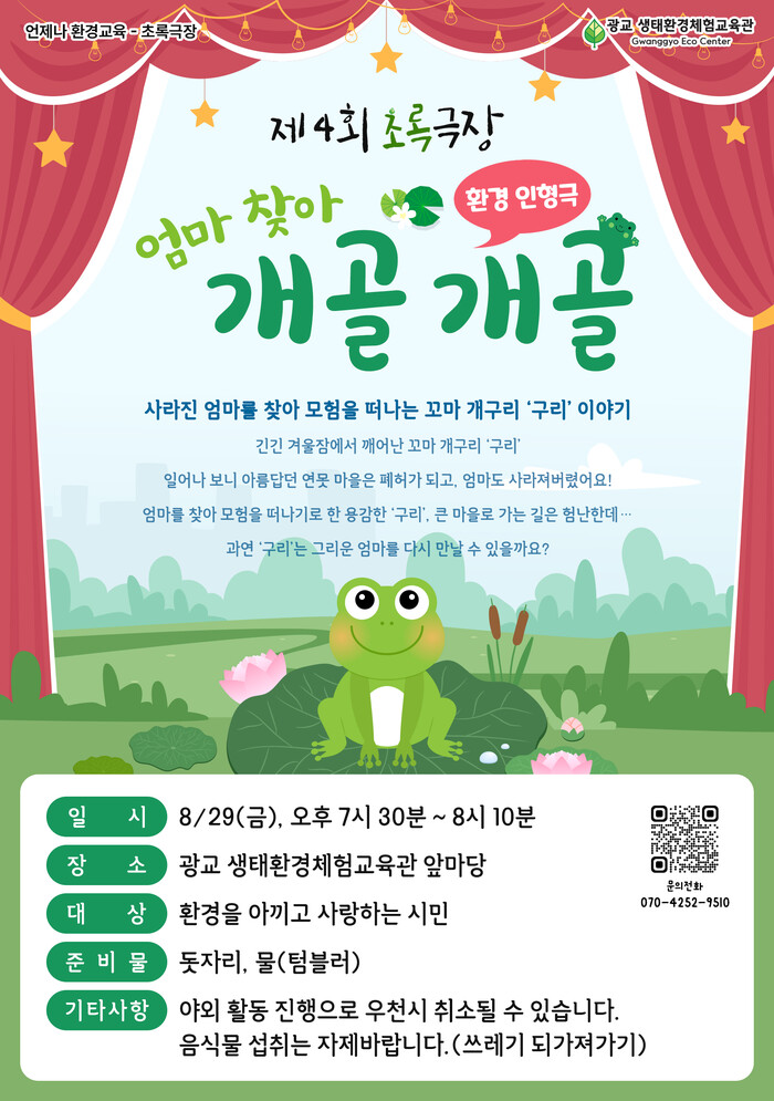 수원시 광교 생태환경체험교육관이 8월 29일 오후 7시 30분, 광교 호수공원 내 생태환경체험교육관 앞마당에서 환경 교육 인형극 ‘제4회 초록극장’을 연다.