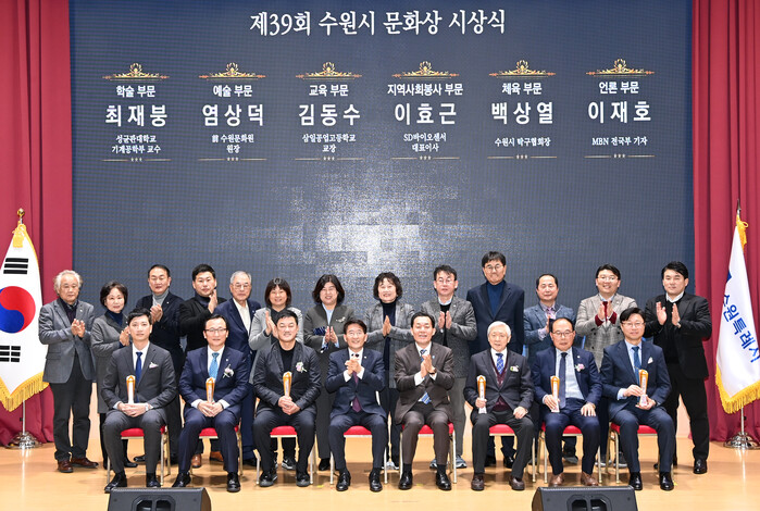 수원시는 19일 시청 대강당에서 ‘제39회 수원시 문화상’ 시상식을 열고, 수상자 6명에게 트로피를 수여했다.