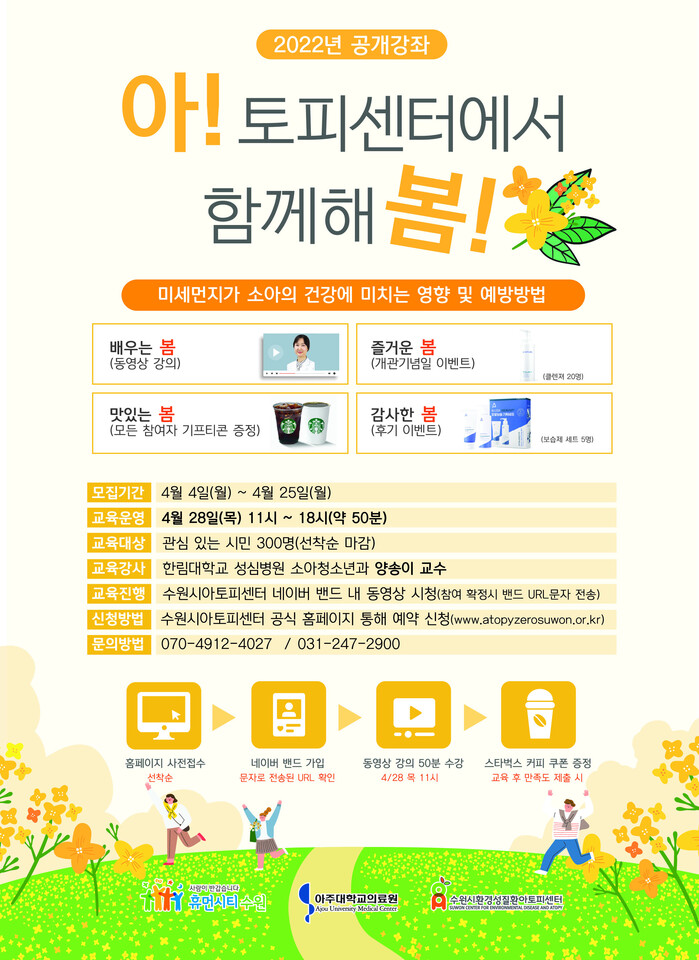 수원시환경성질환아토피센터는 4월 28일 오전 11시 열리는 온라인 강좌 ‘미세먼지가 소아 건강에 미치는 영향과 예방법’ 참여자를 25일까지 모집한다.