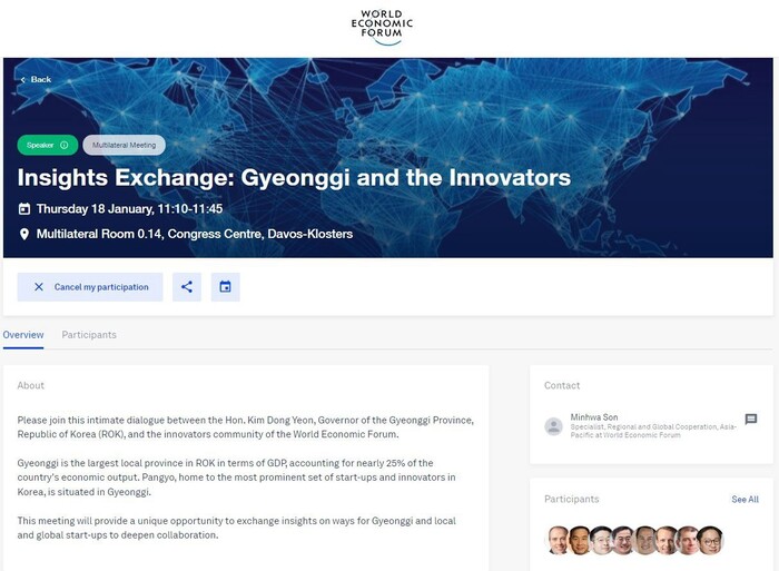 김 지사는 현지 시각 17일 밤 11시 30분(한국 시각 오전 7시 30분) 누리소통망 생방송을 통해 “재밌는 일이 벌어졌다. 세계경제포럼에서 저를 초청하는 유니콘기업(거대신생기업) 세션을 만들었다”라며 세션 개최 소식을 전한 바 있다.