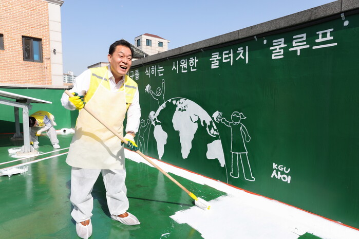 수원시자원봉사센터는 18일 곡반정경로당에서 이재준 수원시장과 허정문 수원도시공사 사장, 이영인 수원도시재단 이사장, 최순호 수원FC 단장 등 공공기관장이 참석한 가운데 지붕에 특수 도료를 칠해 경로당 내 온도를 낮추는 ‘쿨루프’를 시공했다.