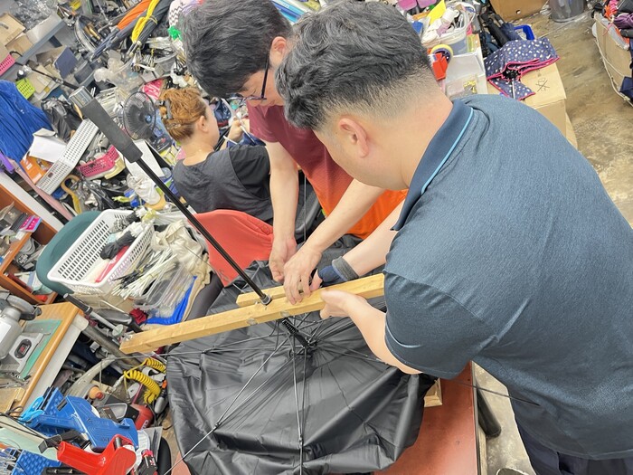 수원시가 ‘2024년 지역공동체일자리사업’으로 추진한 찾아가는 우산 수리센터’는 우산 수리 전문가에게 교육받은 지역공동체 일자리사업 참여자들이 4개 구를 순회하며 고장 난 우산을 무료로 고쳐주는 서비스다.