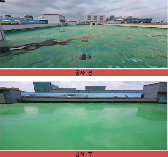 사진/수원시 기업환경 개선사업에 참여한 한 공장의 천장 누수 방수공사 전후 모습.(사진제공=수원시)