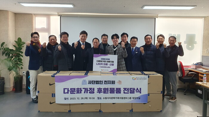 사단법인 천지회 회원들이 1800만 원 상당의 의류, 신발 등을 기부했다. 후원 물품은 도움이 필요한 다문화가정에 전달될 예정이다.