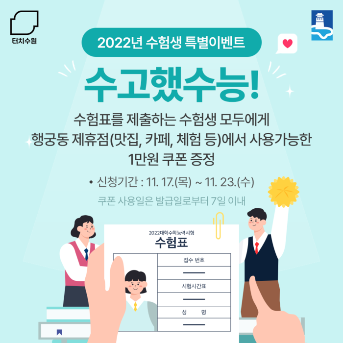 수원시가 ‘터치수원’를 활용해 대학수학능력시험 수험생들을 위한 특별이벤트 ‘수고했수능!’을 진행한다.