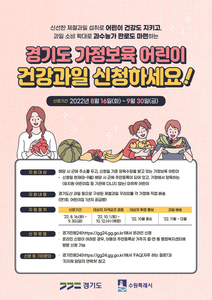 수원시가 8월 16일부터 9월 30일까지 ‘2022년 경기도 가정보육 어린이 건강과일 지원사업’ 대상자를 모집한다.