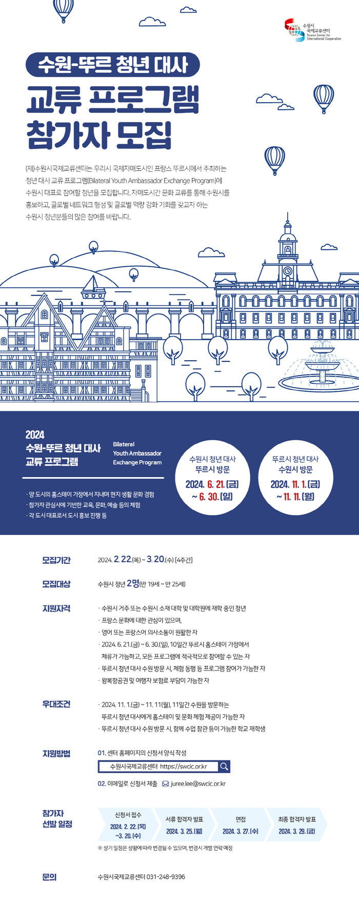 수원시국제교류센터가 ‘2024 수원-뚜르 청년 대사 교류 프로그램’에 참가할 청년(만 19~25세) 2명을 3월 20일까지 모집한다.