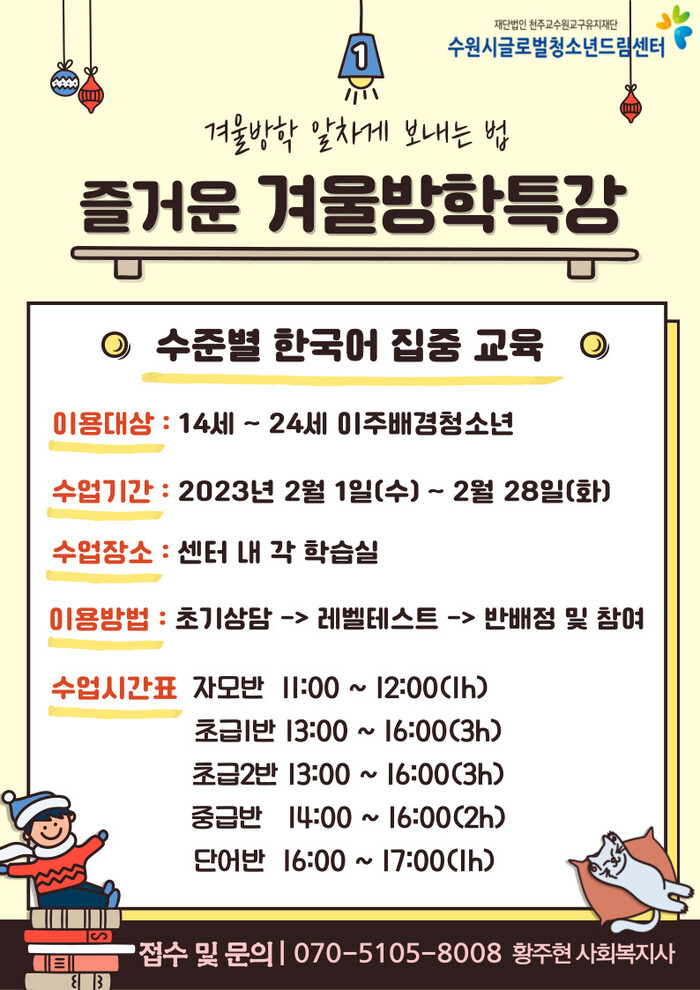 수원시 글로벌청소년드림센터 홈페이지(www.swglobalyouth.com/main.asp)의 ‘커뮤니티→프로그램안내’에 게시된 ‘2023년도 수준별 한국어 「훈린(隣,이웃)정음」 겨울방학 특강(한국어수업) 참여자 모집’에서 자세한 내용을 확인할 수 있다.