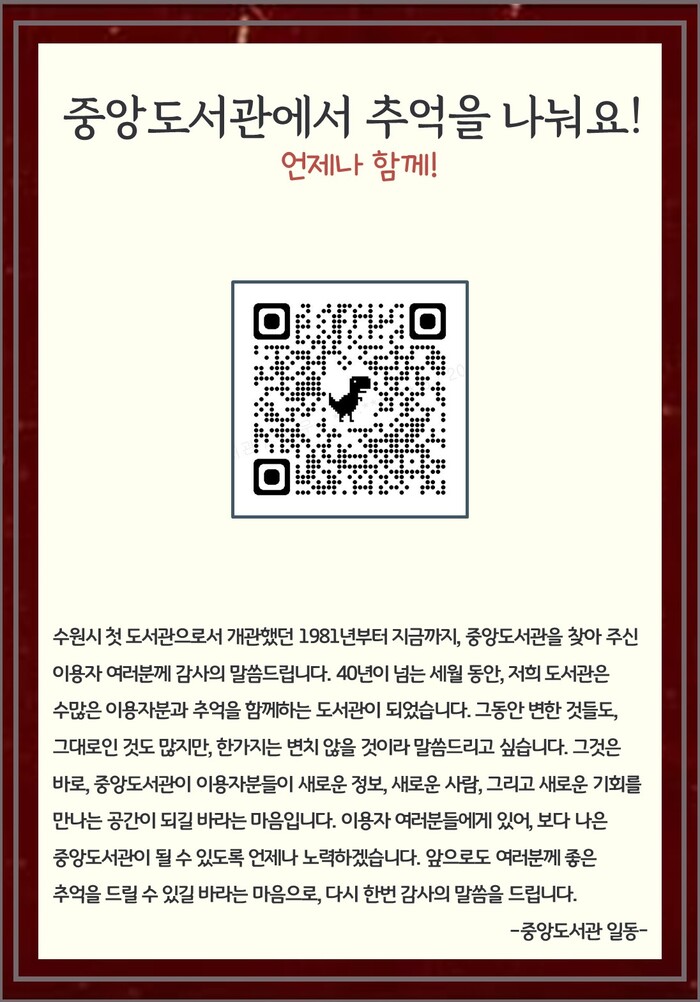 수원중앙도서관이 40여 동안 시민들에게 받은 사랑에 감사하는 마음을 담은 홍보 트레일러(예고) 영상을 제작했다.